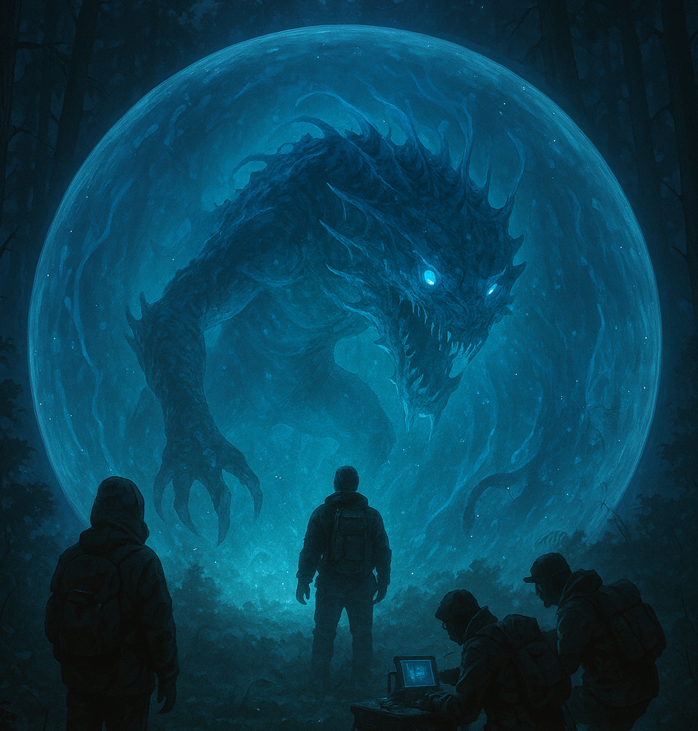 A spear of auroral fire punched skyward, an arc of electromagnetic fury that painted the clouds in impossible colors. Night vanished, drowned in a brilliance like magnesium flares and noon sun combined. Trees cast razor-sharp shadows in all directions. For a moment, it looked as if a new sun had risen from the forest floor.